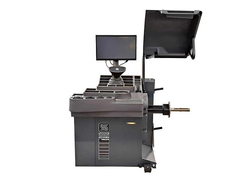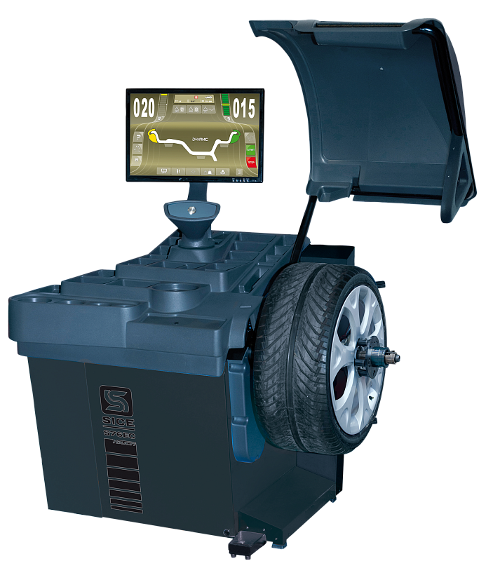 Stationary wheel balancing machine with automatic quick action clamp for balancing passenger car wheels with a rim diameter of up to 32 inches and a wheel weight of 85 kg. The automatic quick action clamp ensures that the wheel is fitted precisely. Tightening torque monitoring ensures that every wheel can be balanced under the same conditions.