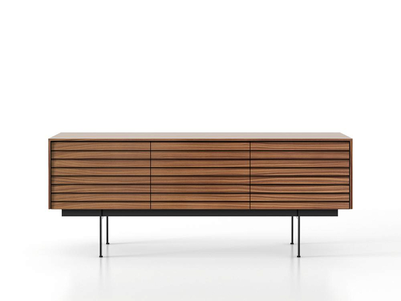 The Sussex sideboards are characterized by an elegant design and high quality. The design is inspired by the characteristic wood panel paneling of barns in southern England. These repeated horizontal slats hide the composition of the modules and serve as handles for the doors. The door elements include a height-adjustable shelf.