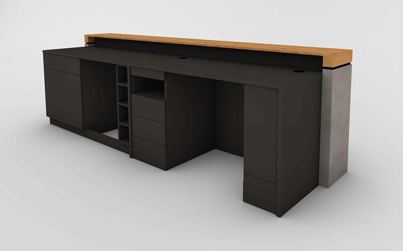 The reception counter in combination with the bar counter welcomes visitors and represents the company's philosophy. At the same time it is a workstation meeting all ergonomic requirements. In addition, it is a bar counter depicting a specially designed counter in a bar where drinks are prepared and served. The design of a bar counter takes into account aesthetic, ergonomic and practical aspects to create an efficient working environment for the staff as well as an inviting ambience for guests. The BMW reception counter programme offers optimal conditions for perfectly fulfilling this triple function. One of the strengths of this combination is its high degree of variability. Thanks to the intelligent basic construction kit and a broad range of equipment and design variants, a wide variety of solutions can be implemented with very little effort, depending on the requirements. Thus, the commitment to high standards is consistently maintained, ensuring that people will always feel comfortable – whether in front of or behind the counter.