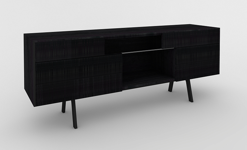 The selected high-quality furniture has a modern and equally timeless design language, veneer surface and wonderfully handcrafted workmanship down to the last detail. Powder-coated steel base, Oak black veneer stained and lacquered body surface, relief front. The veneer surface is a natural product and has a nice feel.