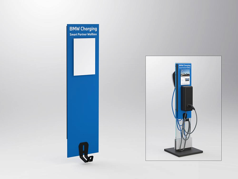 L 310 x W 162 x H 1080 mm, adapter plate for the BMW Smart Partner Wallbox. Mounting plate made of silver matt powder-coated sheet steel for hanging on a PHEV 2.0 pedestal incl. a locking plate to prevent unhooking. Front panel made of wood, RAL (Default:D2 Design) 260-40-45 satin finish, for screwing on a BMW Smart Partner Wallbox, incl. lettering "BMW Charging" "Smart Partner Wallbox", a pre-mounted cable holder made of black powder-coated sheet steel and a pre-mounted information sheet holder DIN A4. The BMW Smart Partner Wallbox used, e.g. Shell New Motion - Home Edition or EON-Ebox Professional or Garo - GLB+ or ABB - Terra AC or Schneider - G4 or Alfen - Single Pro Line or EVBox - Elvio der Powerdale - Nexxtender_Home, must be ordered separately. This is not included in the scope of delivery.