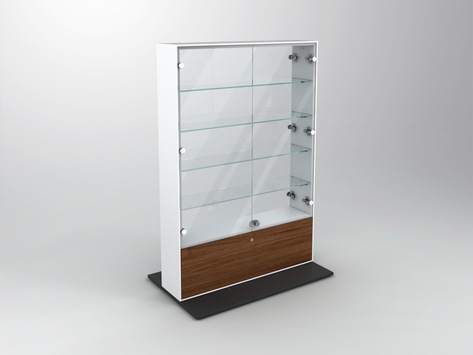 Showcase for Small Merchandise Items with 5 glass shelves, incl. 2x LED set across the entire shelf length, glass doors and locking system. Body with closable flap.