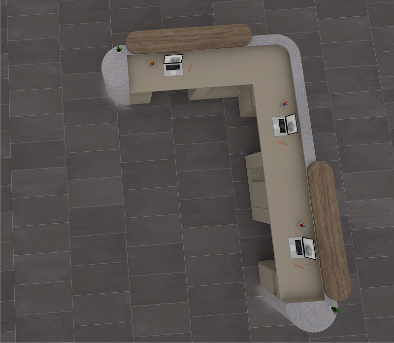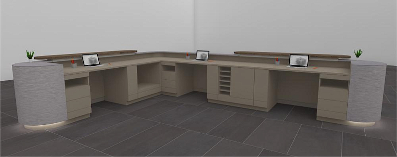 The modular multifunctional counter, with a straight front and rounded finishing elements, provides a high-quality and aesthetic overall impression where clear forms meet a reduced design and well-thought-out CI equipment. Thanks to the large number of different elements, it is possible to configure the counter according to your own needs.