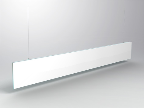 Sign is hanging from the ceiling and helps highlighting the different areas of business. Outsides are acrylic glass (back-printed in white), sides are covered with anodised aluminium. Best used for 16 to 23 characters. Steel cable for mounting included. Sign does not glow.