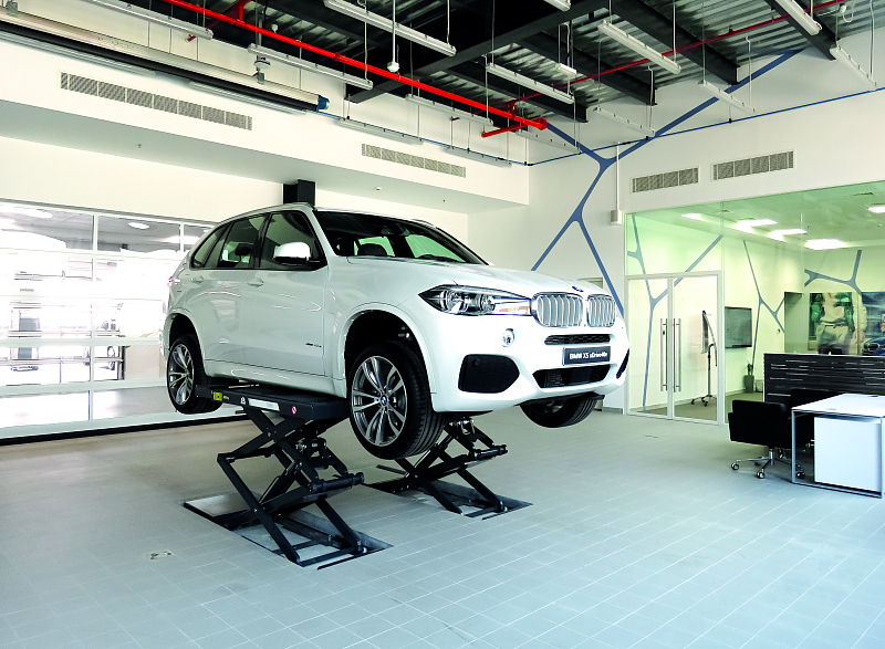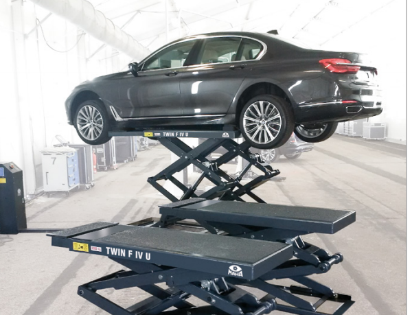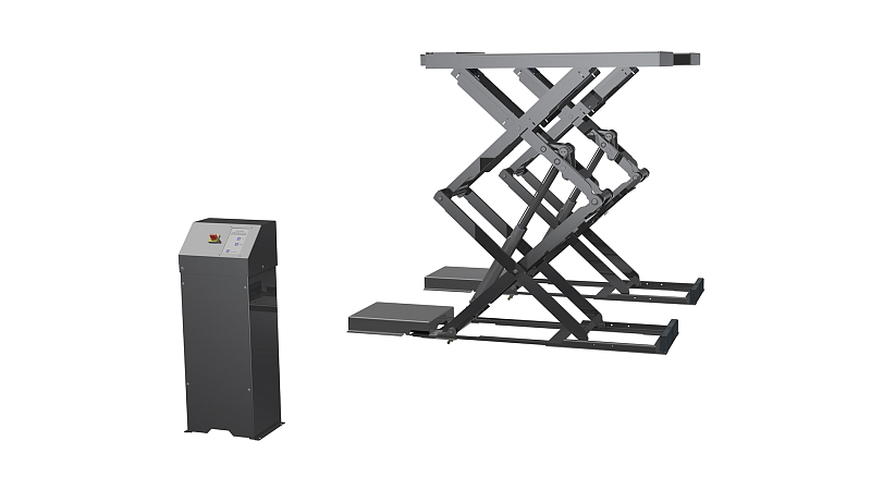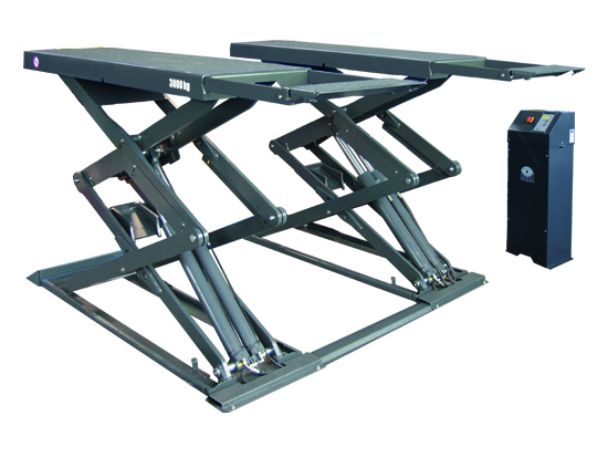 Hydraulic double scissor lift with 3 tonne load capacity for flush-to-floor installation.