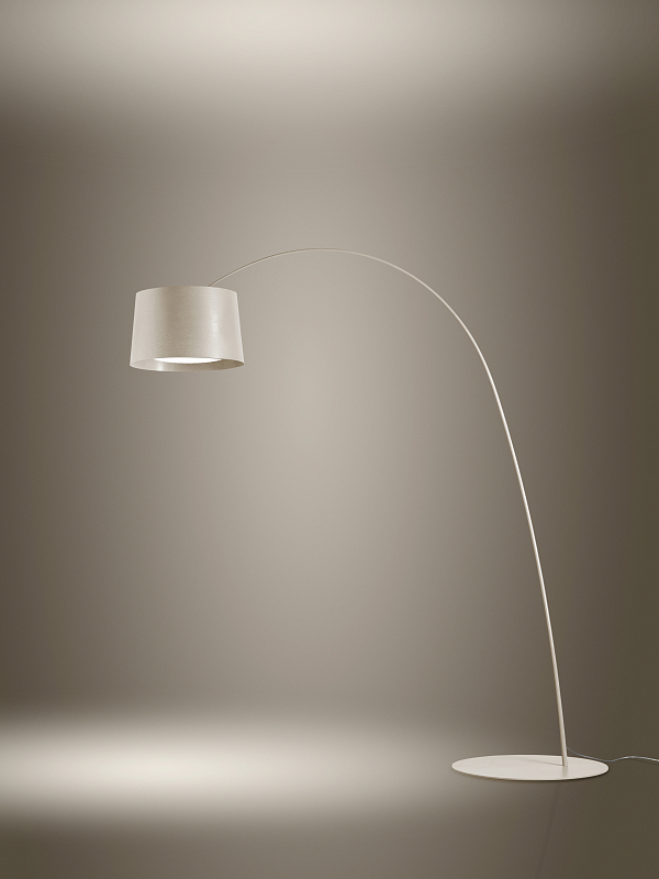 Floor lamp with direct and indirect light. Floating on a stand, like a curved fishing rod and adjustable using counterweights, the Twiggy floor lamp presents itself as a simple brilliant idea that has become an icon among designer arc lamps and adapts to various interior design and lighting needs.