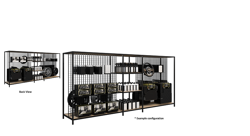 In the Service Area, the presentation of physical Parts & Accessories products is part of the Sales and consultation process. In the multifunctional shelving system products can be optimally presented. The display of physical Parts & Accessories products should be concentrated within one location of the showroom within the Service Area and preferably in close distance to the Central Customer Hospitality Area. Physical Parts & Accessories products are preferably presented within a shelving system. Recommended assembly kits: MINE3102017 and MINE3102020 or MINE3102022 and MINE3102023