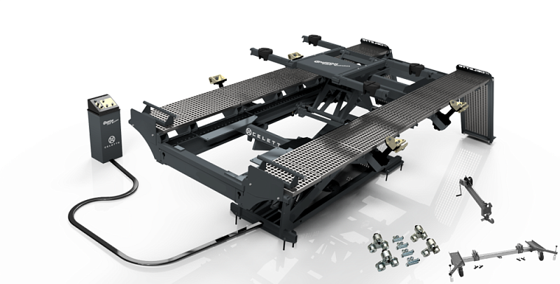 Celette Griffon straightening bench with drive-on ramps, scissors hoist unit and wheel-free lift. This means the vehicle can be driven straight on to the straightening bench and anchored. No additional vehicle hoist is required to place the vehicle on the straightening bench.