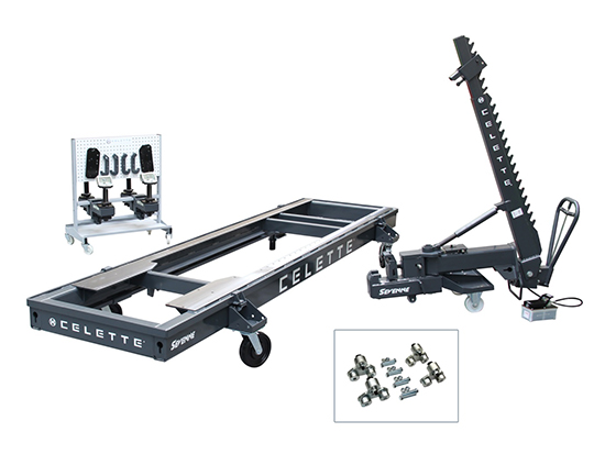 The special frame to anchor the wheels quickly has a module hole pattern. 4 anchoring clamps can be secured easily and quickly to the straightening frame and adjusted in a linear direction. The wheels can be fitted easily and quickly any required or desired position by the special new frame on the straightening bench. The shell-shaped wheel supports can be used as trays for nuts, bolts, etc. two of the four wheels have brakes. The SEVENNE straightening unit can be easily secured around the straightening bench. The push and pull arm is easy to adjust and versatile. In addition to the module crossbeams and MULTI-Z mounts, straightening attachments and possible portal fixtures for the specific vehicle are also required.