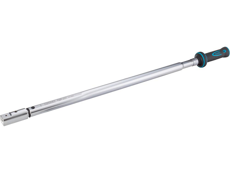 Torque wrench with socket connection for accommodating sockets. Acoustically and visually (red signal button) perceptible automatic short-travel triggering when the set torque value is reached. Torque value is set by turning the handle. Handle made from oil- and petrol-resistant plastic jacket. Tolerance +/- 2%; Insert square: 14 x 18 mm