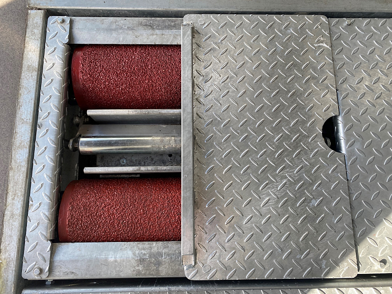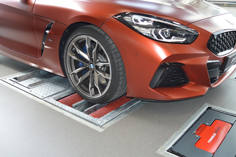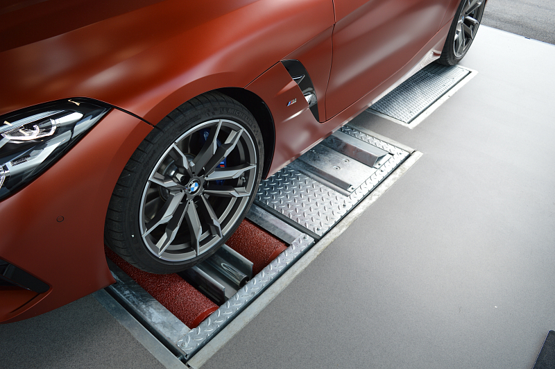 Brake test bench with plastic-coated rollers. The plastic coating (granulate) offers improved grip under all test conditions, even under critical conditions, such as a light vehicle with summer tires on wet surface.