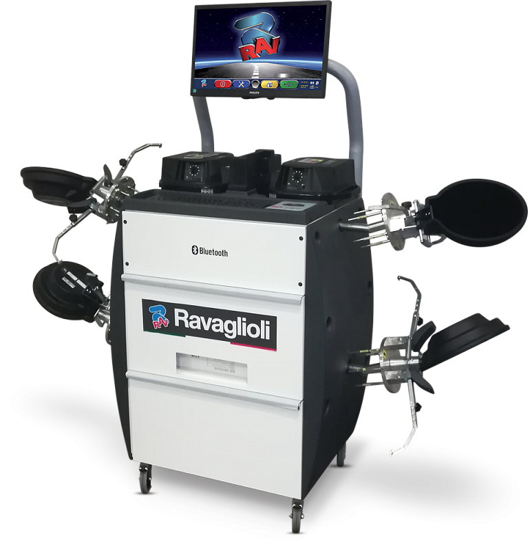 3D wheel alignment equipment with BMW quick action clamp with tracer pins. The tracer pins are positioned in the polycontrol bores of the wheel rim, allowing the vehicle to be measured without wheel rim impact compensation (vehicle roll-in). The use of sensitive measuring technology on the wheel is not required due to 3D reflectors. The data transfer between the pickups on the axis measuring station and the equipment cabinet takes place wirelessly via Bluetooth. In addition, the pickups are supplied via a NiMH battery, which makes a costly cable routing on the wheel alignment station unnecessary. Throughout the measuring process, the ride height is continuously transmitted to the wheel alignment computer. This means the correct nominal data are determined and compared with the actual data at all times according to the ride height.