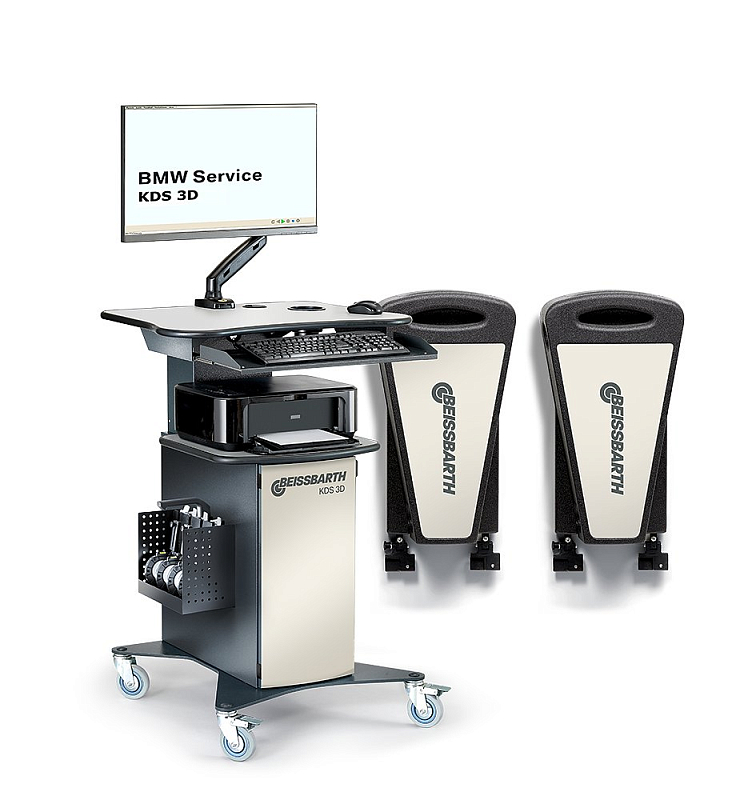 Unlike the BMW KDS II the BMW Beissbarth KDS 3D determines the ride height live during the entire alignment process. In this way, the correct target data are constantly determined corresponding to the height and compared against the actual data. A wireless version is also available.