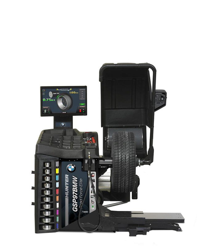 Stationary wheel balancing machine with automatic quick action clamp for balancing and diagnosing passenger car wheels with a rim diameter of up to 30 inches and a wheel weight of 79 kg. The automatic quick action clamp ensures that the wheel is fitted precisely. Tightening torque monitoring ensures that every wheel can be balanced under the same conditions. Special feature: The GSP97 BMW RFE enables the detection of vibration problems which cannot be solved by balancing the wheel with tyre. So-called radial force fluctuations are involved here. These radial force fluctuations can be caused by out-of-round wheel rims and out-of-round and hard places in the tyre. The Hunter GSP97 BMW-RFE identifies these force fluctuations by means of a road force measurement in which a separate road roller presses against the tyre with 567 kg. After the measurement, recommendations are displayed on how to twist the tyre and wheel rim together to keep force fluctuations to a minimum. Lateral pull problems caused by the tyre can be identified and reduced using an additional integrated lateral force measurement. The lateral force measurement outputs suggestions on the position in which the corresponding wheel should be mounted in the vehicle. The goal is to position the wheels so that the lateral forces introduced by the tyres cancel each other out as much as possible. In a balancing process, all relevant data for the diagnosis of the wheel with tyre is determined. As a result, recommendations for optimising vibration and lateral pull or positioning balance weights are displayed on the wheel rim.