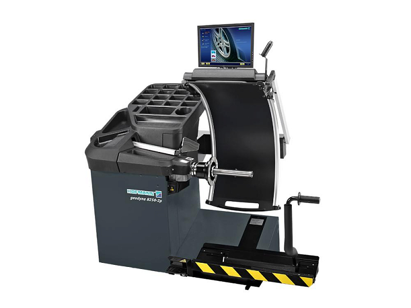 Stationary wheel balancing machine with automatic quick-action clamp for balancing passenger car wheels up to a rim diameter of 32" and integrated wheel lift for wheels up to 70 kg.