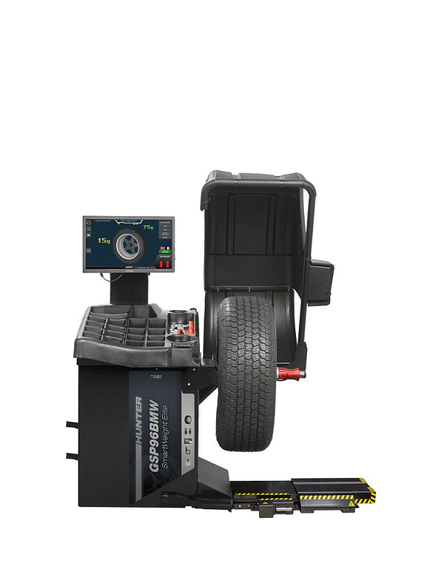 Stationary wheel balancing machine with automatic quick action clamp for balancing and diagnosing passenger car wheels with a rim diameter of up to 30 inches and a wheel weight of 79 kg. The automatic quick action clamp ensures that the wheel is fitted precisely. Tightening torque monitoring ensures that every wheel can be balanced under the same conditions.